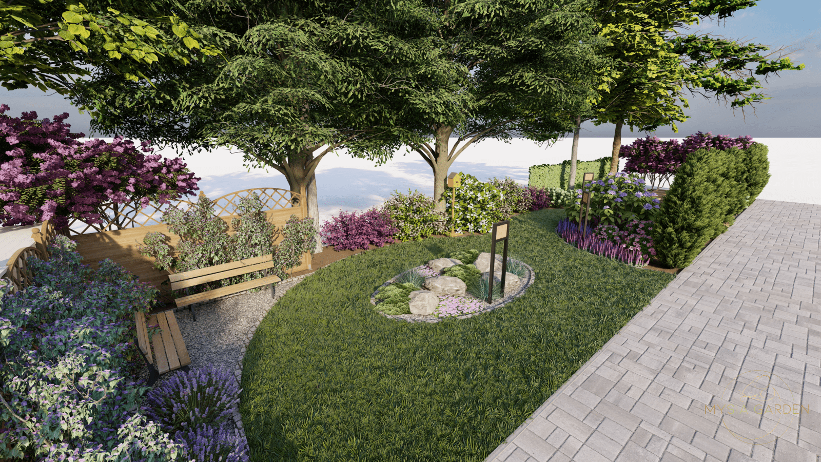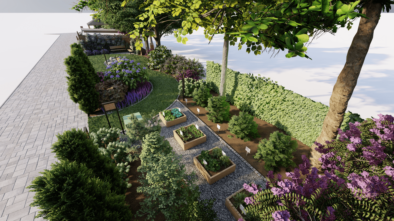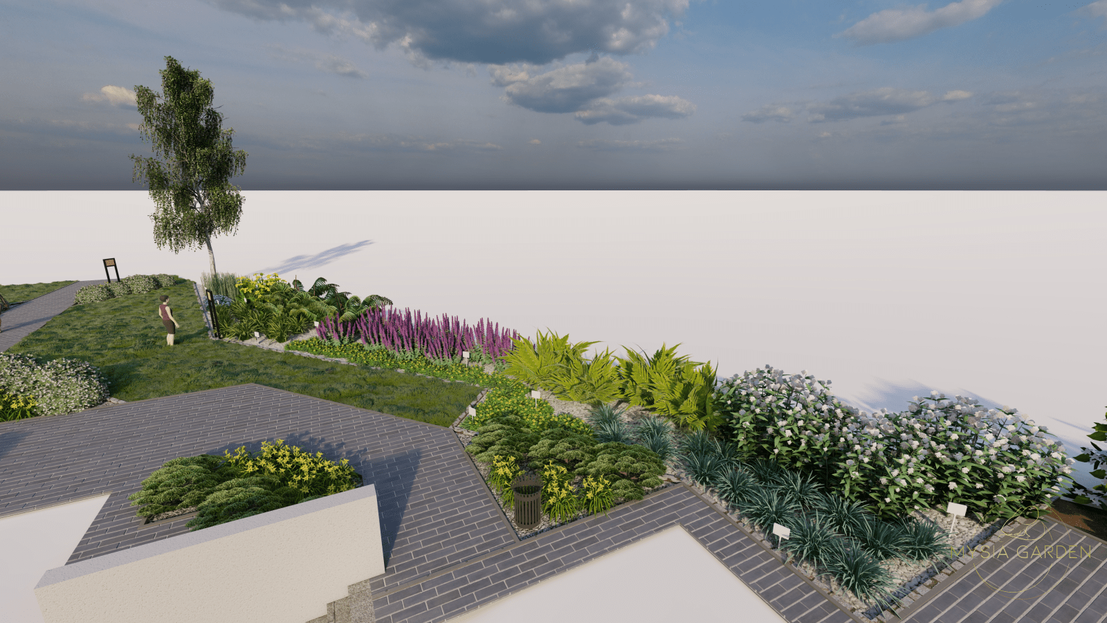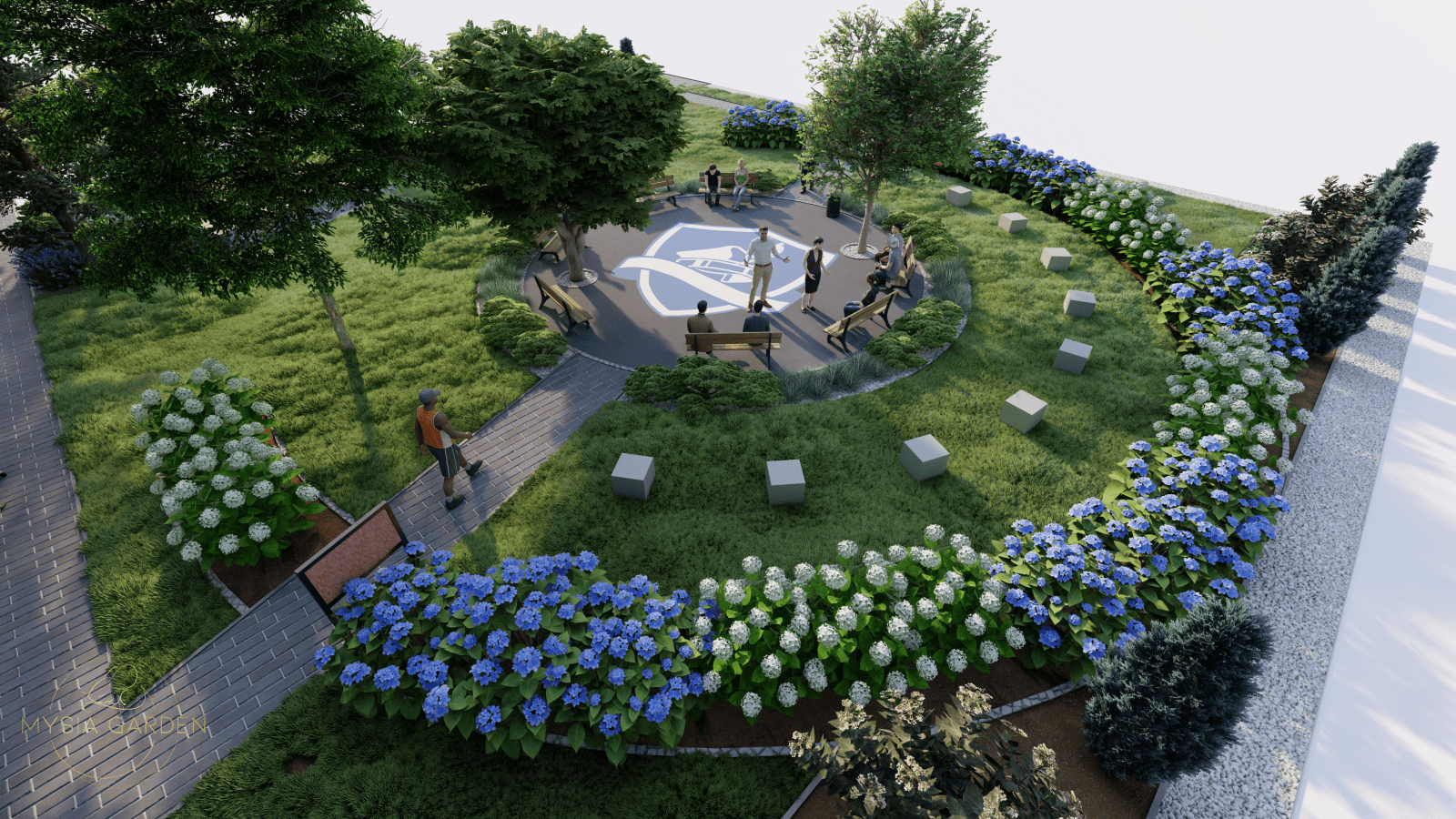 Tutaj motywem przewodnim były barwy szkoły jakimi są biały i niebieski, dlatego przy dobrze roślinności kierowano się tymi kolorami. Na całości założenia powstały strefy z tablicami edukacyjnymi tym razem w tematyce przyrodniczo-ekologicznej. Główną atrakcją jest plac z nawierzchni mineralno-żywicznej z logo szkoły, który otoczony jest półkolem z hortensji na przemian sadzonych odmian o kolorze kwiatów białych i niebieskich. Przestrzeń ta została otwarta na scenę, na której będą organizowane imprezy szkolne.