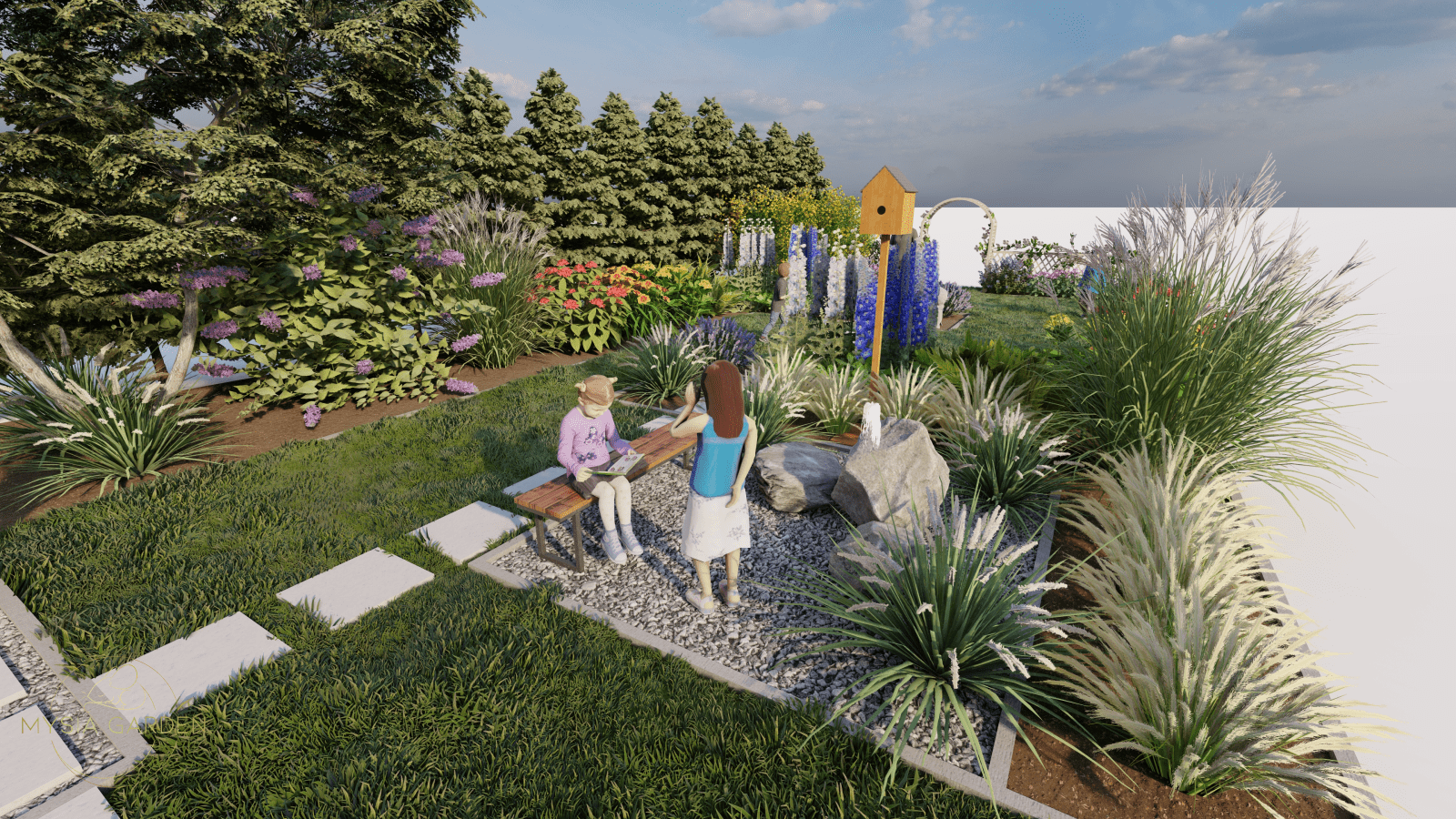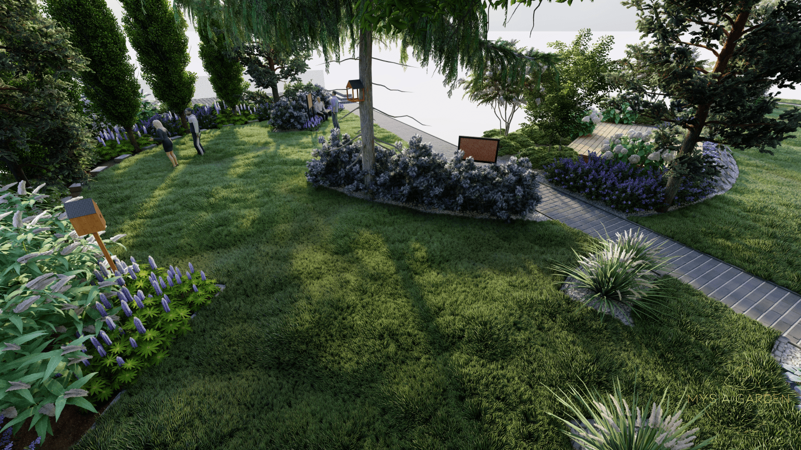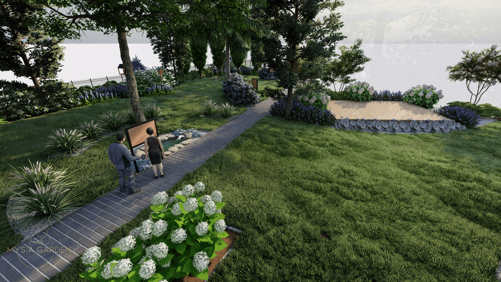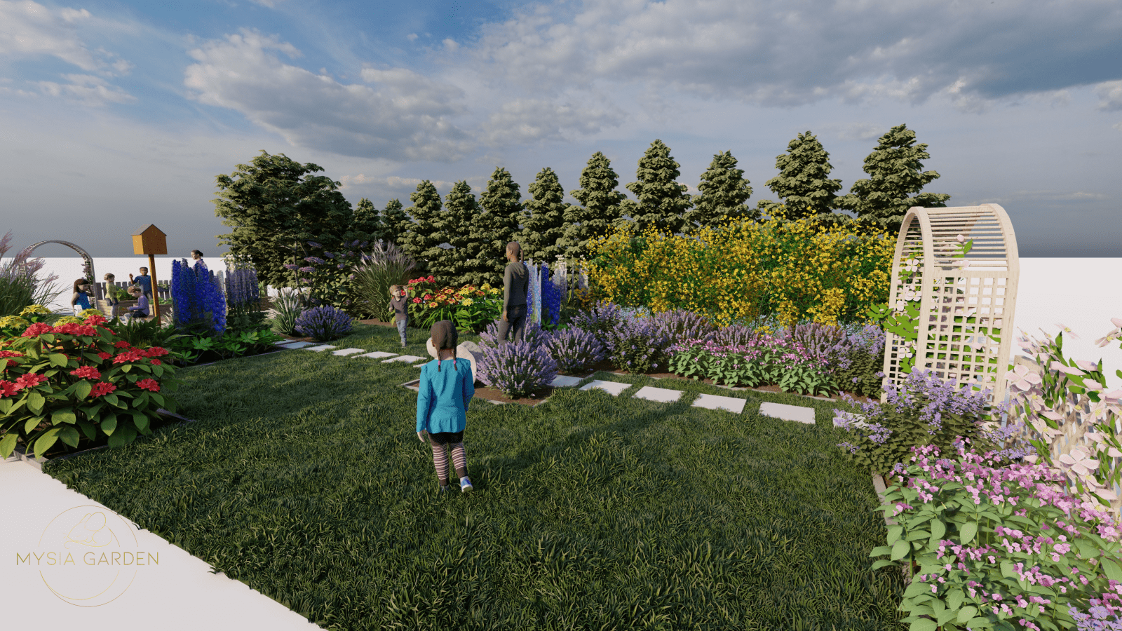 Tutaj motywem przewodnim były barwy szkoły jakimi są biały i niebieski, dlatego przy dobrze roślinności kierowano się tymi kolorami. Na całości założenia powstały strefy z tablicami edukacyjnymi tym razem w tematyce przyrodniczo-ekologicznej. Główną atrakcją jest plac z nawierzchni mineralno-żywicznej z logo szkoły, który otoczony jest półkolem z hortensji na przemian sadzonych odmian o kolorze kwiatów białych i niebieskich. Przestrzeń ta została otwarta na scenę, na której będą organizowane imprezy szkolne.