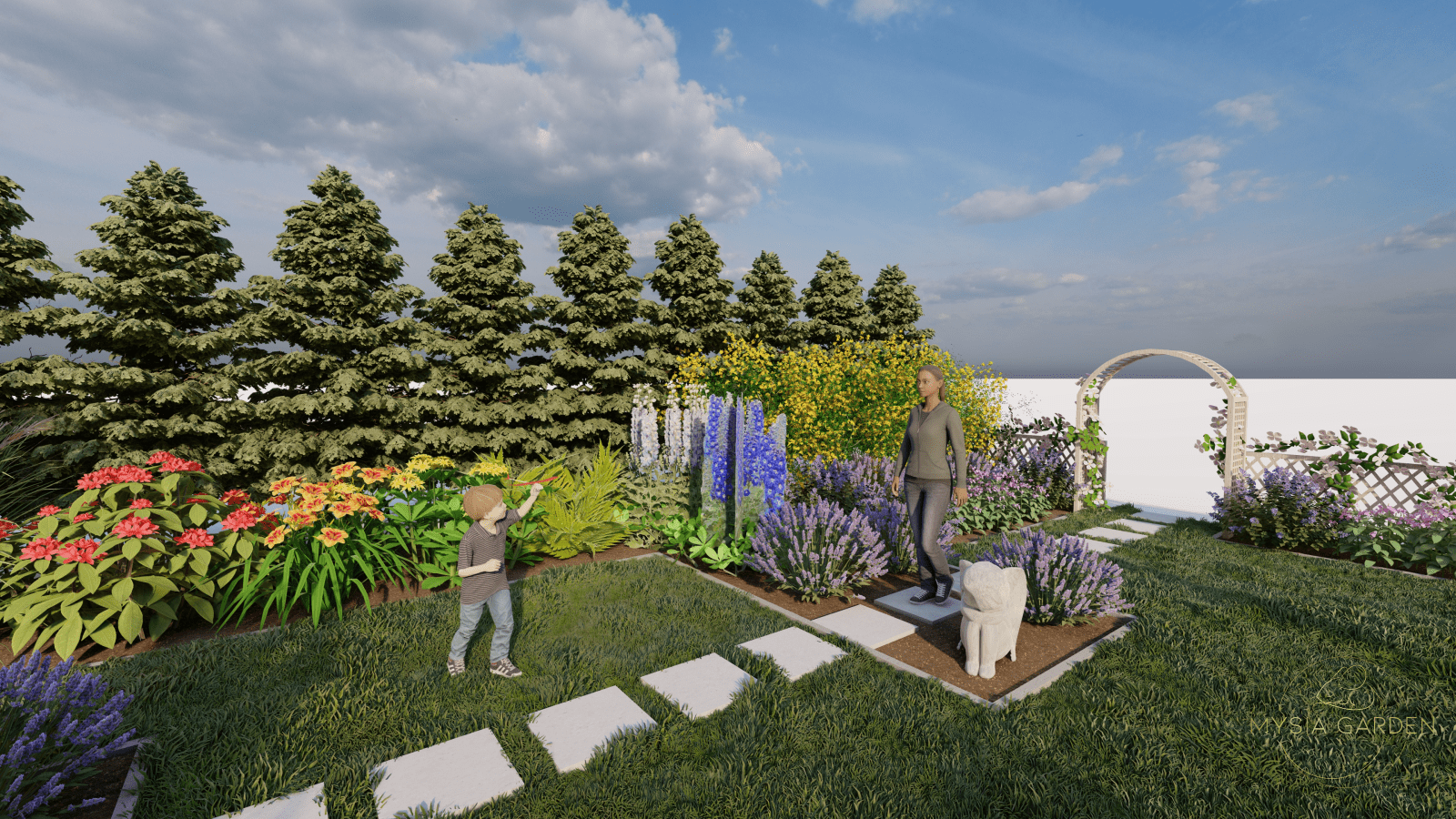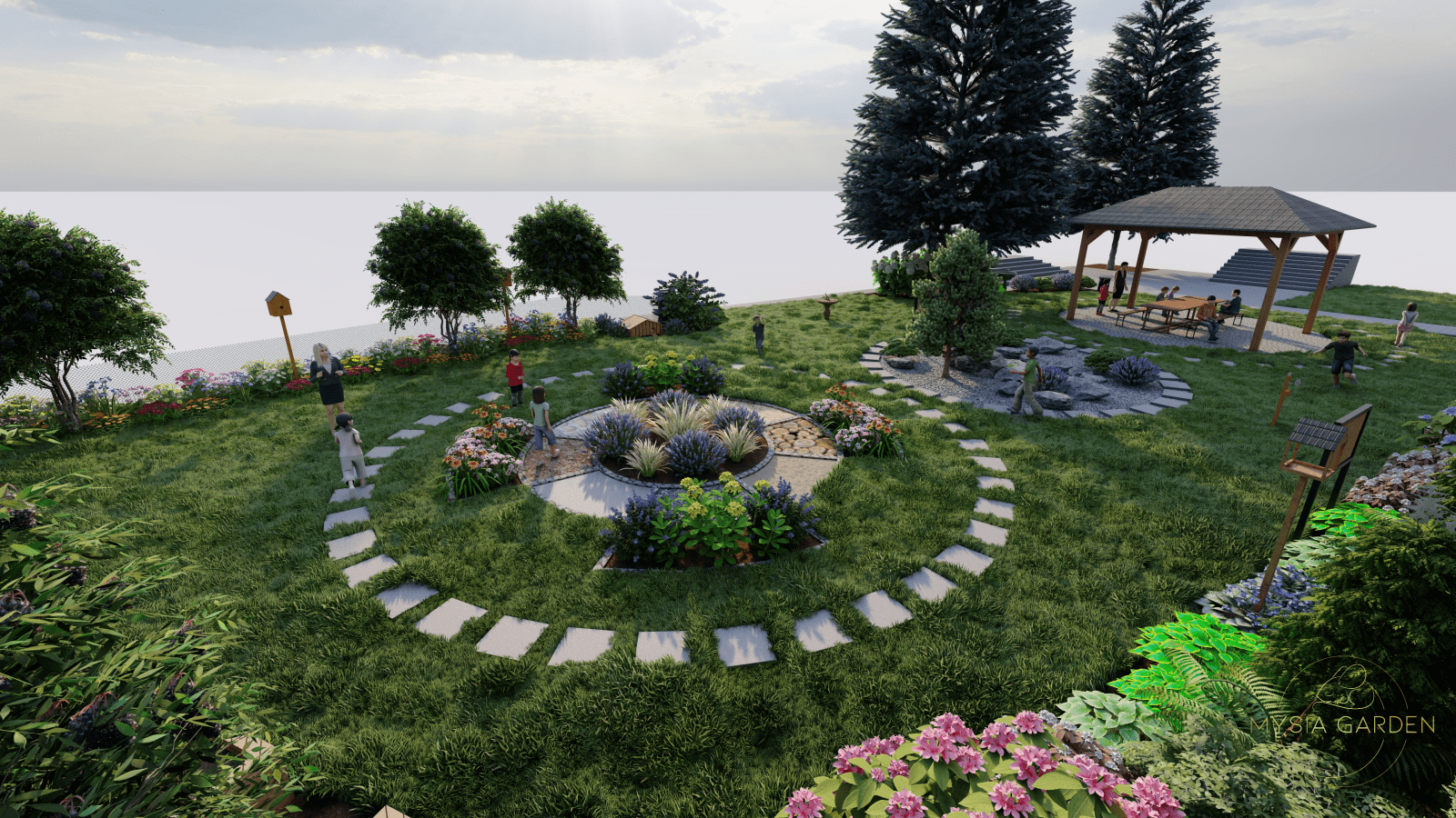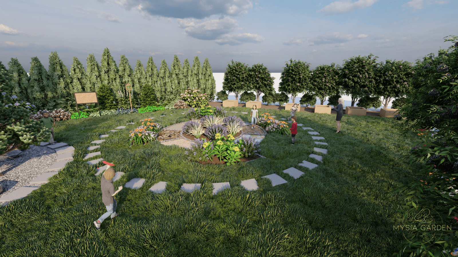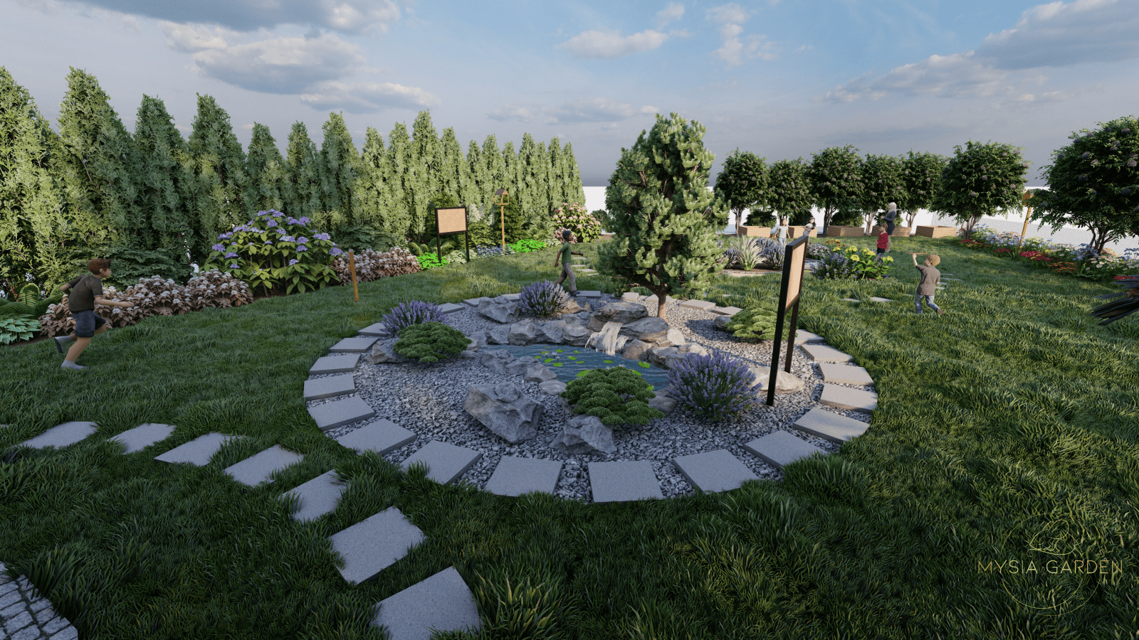 Motywem przewodnim dla tego założenia było stworzenie ścieżki edukacyjnej, której tematem wiodącym były informacje i ciekawostki o patronie szkoły. Z tego względu powstało 10 różnych stref tematycznych, które były oznaczone tablicą edukującą, a otaczająca ją przestrzeń i roślinność nawiązywała do tematyki danej strefy. Przykładowo tablica „Zawirowania sercowe” opowiadały o pierwszych miłościach Tadeusza Kościuszko, dlatego wokół zaprojektowano romantyczną przestrzeń z ławeczką otuloną kwitnącymi różami i hortensjami.