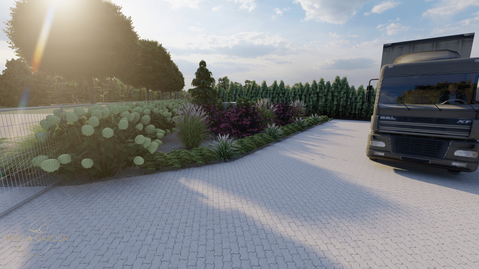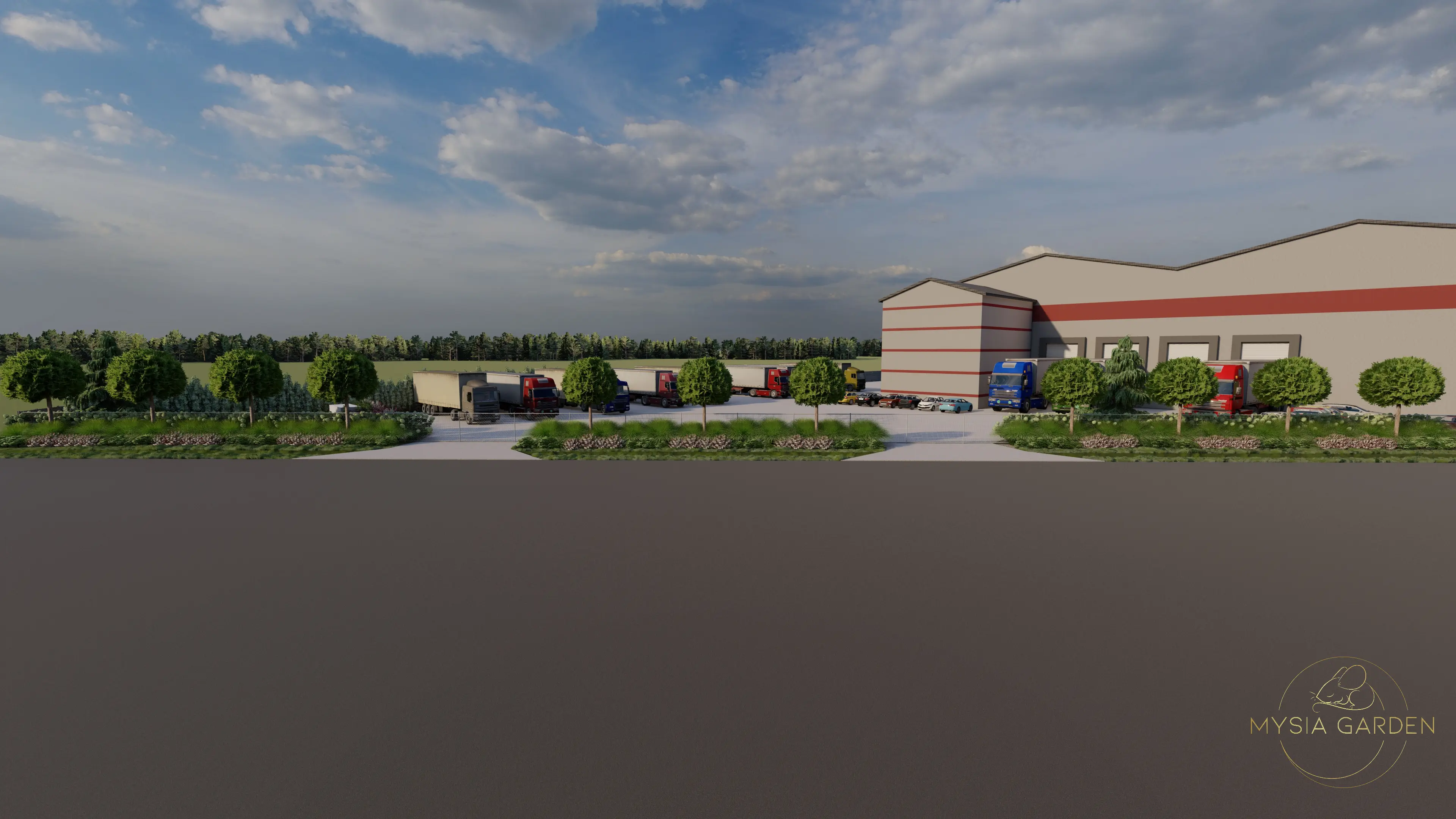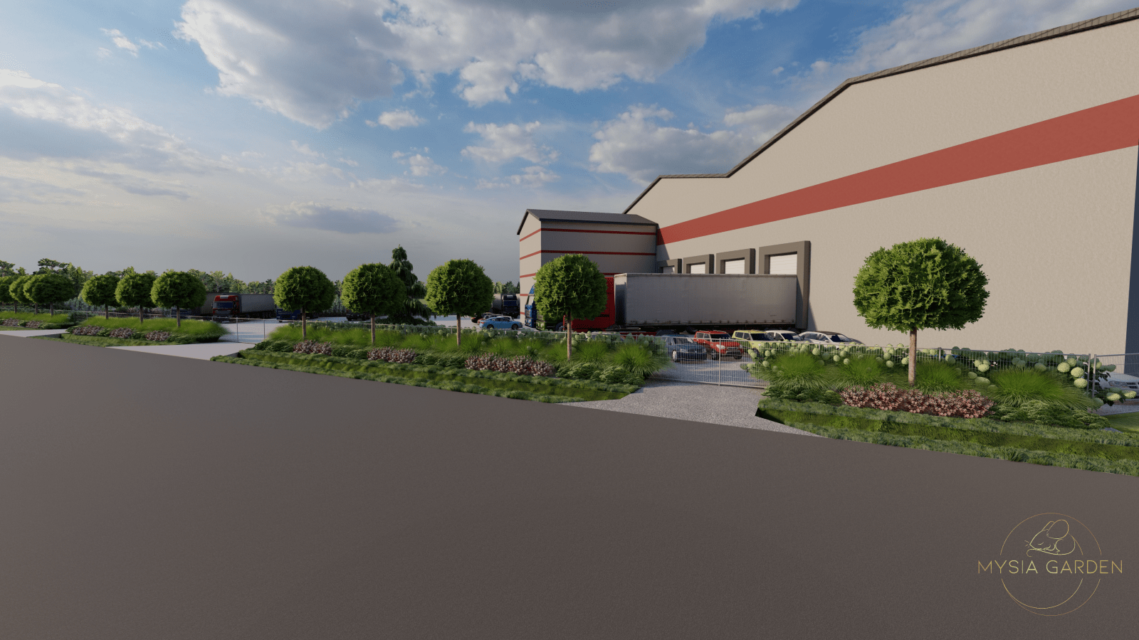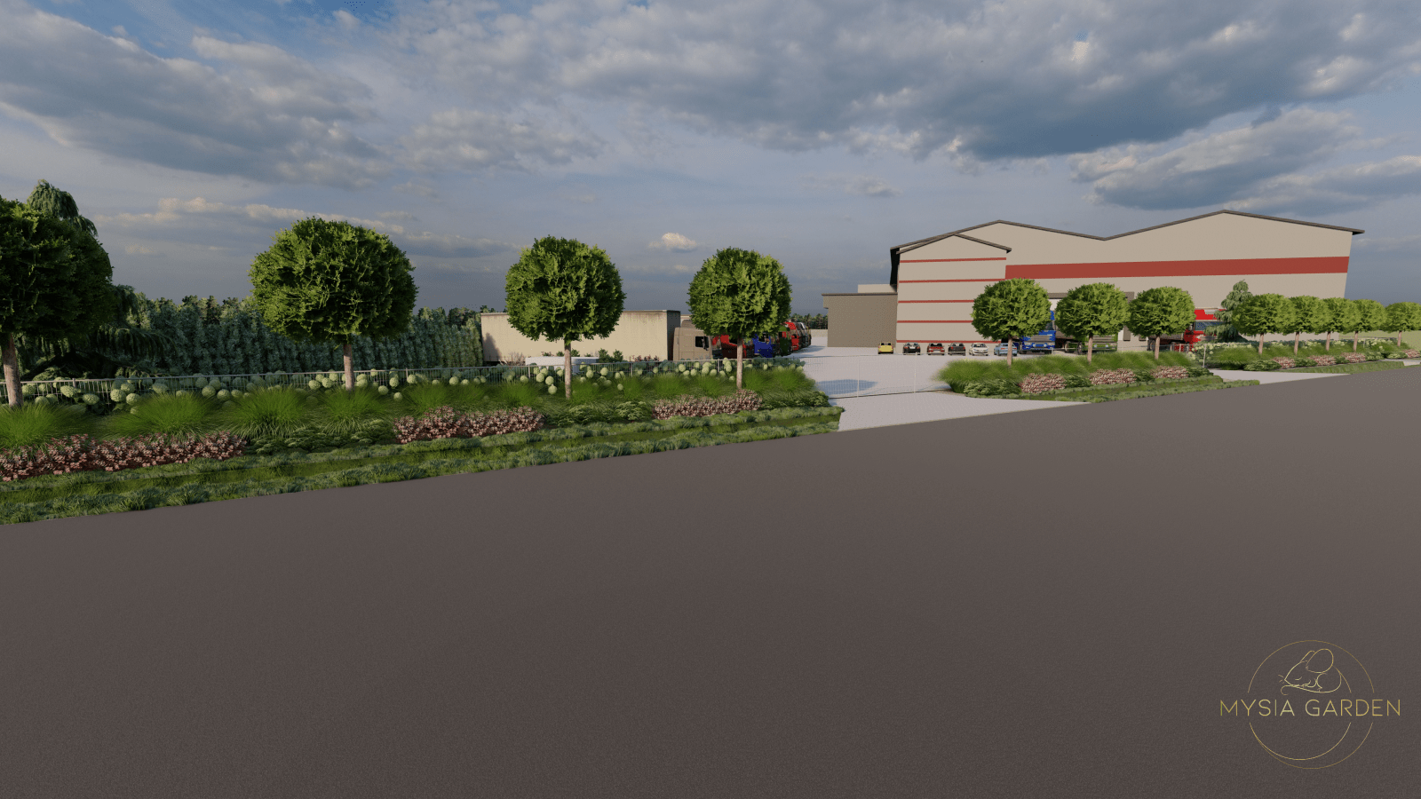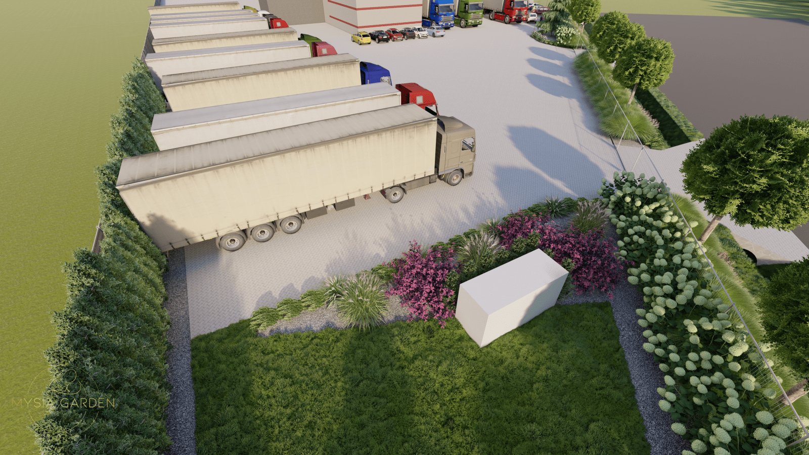 Celem założenia było, podniesie walorów wizualnych tego miejsca z poszanowaniem dla dominującej nawierzchni utwardzonej, która potrzeba jest dla dużych samochodów ciężarowych. Z tego względu zdecydowano się na jednolite nasadzenia przed ogrodzie, które zostały przełamane wyższym piętrem drzew o odmianie charakteryzującej się kulistą koroną. Wewnątrz obiektu zaprojektowano szpalery hortensji oraz pojedyncze rabaty. Zabieg ten spowodował, iż zimna betonowa przestrzeń, została ocieplona zielonymi kompozycjami.